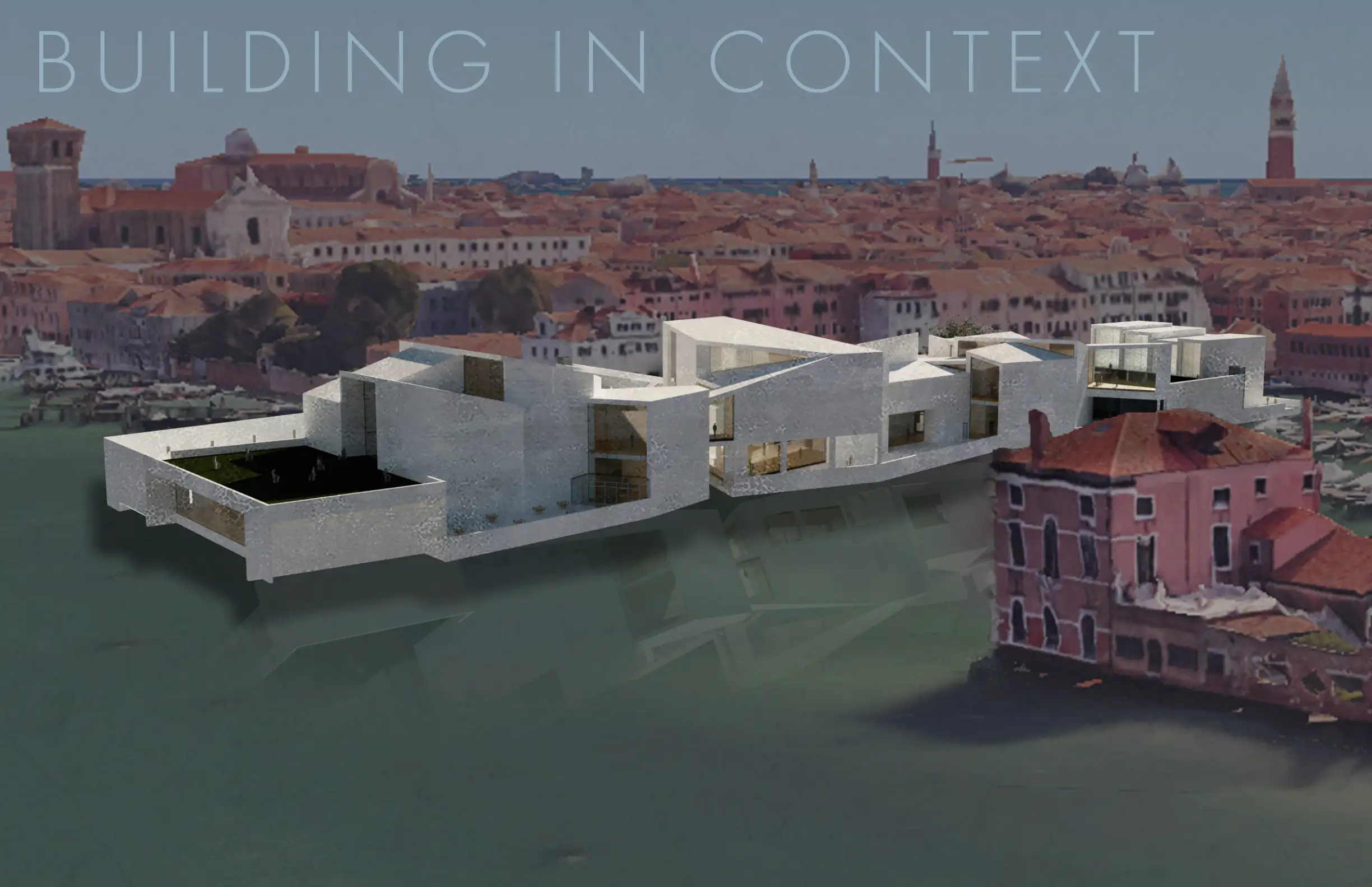 The apertures within the architectural framework not only result from the deliberate subtraction of the building's ribbon but also serve the purpose of orchestrating specific sightlines, reminiscent of the indeliberate perspectives encountered while strolling through the labyrinthine streets of Venice.